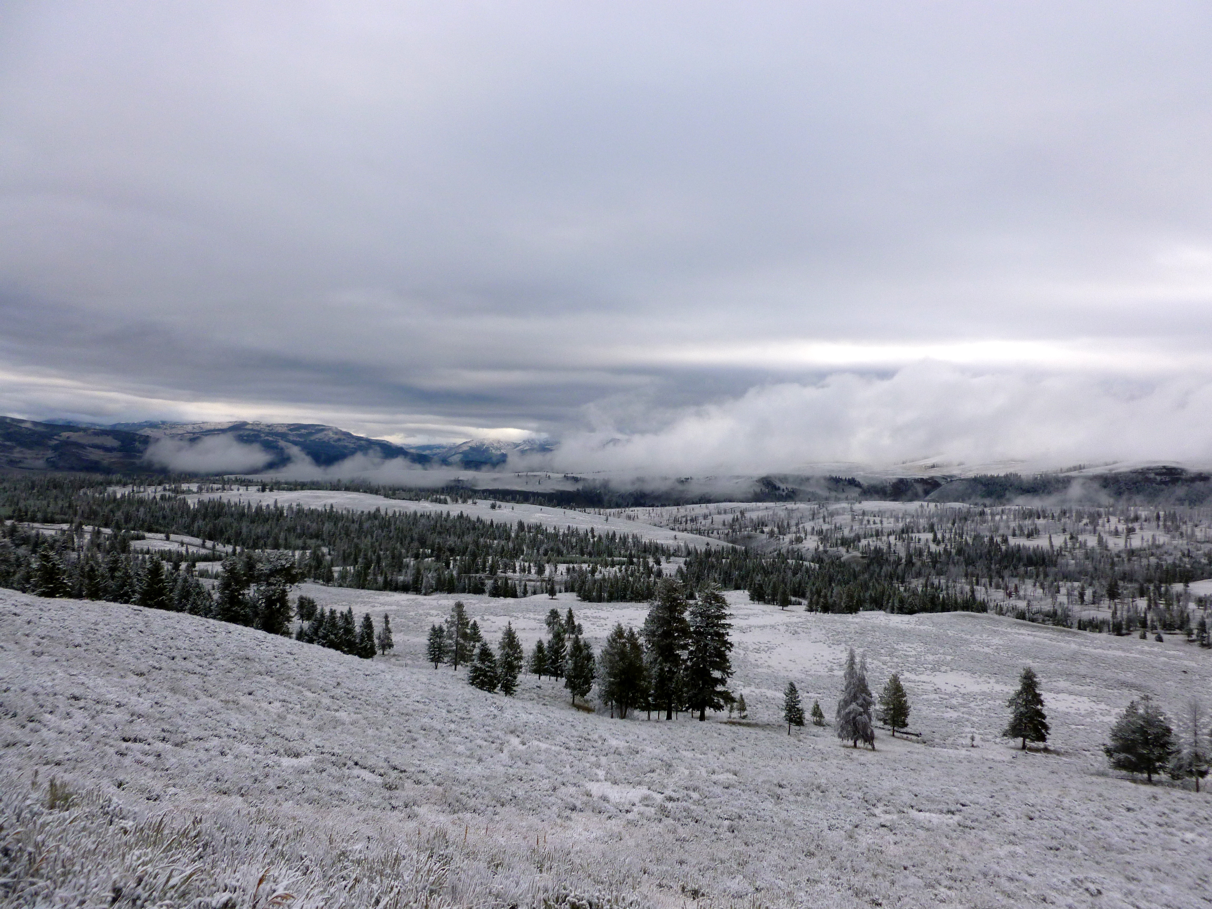 2. Late September through mid May = COLD.  Very cold.  BITTERLY COLD.  So basically 75% of the year is winter.  And I don’t mean the quaint winter wonderland kind of winter.  I mean the FREEZING COLD, massive snow drifts, can’t-travel-except-by-snowmobile kind of winter.  Yikes.  Even in early September, it’s not uncommon to have a bit of snow, as you can see below from Yellowstone.