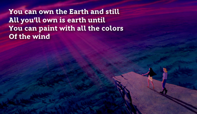 - Colors of the Wind from Pocahontas: Yes, I have a Disney song on here. I’ve never been a big fan of the movie, partly because it’s so historically inaccurate, but I have always loved this song. In today’s fast-paced, technologically advanced world, it’s extremely important to remember the beauty & frailty of nature & that the world is not a limitless supply of resources to fulfill our desires. Yes, we have smart phones that can do more than computers from ten years ago. Yes, the internet has connected the world in ways that our ancestors never even dreamed. None of this is bad, but what is it worth if we destroy our Earth? We must never lose touch of the joy & knowledge that can be found in a simple walk through the woods or gazing at a flower. As the song points out, we are all connected to each other & to the Earth, and thus all of our actions ultimately affect everyone else as well as this planet we inhabit. http://www.youtube.com/watch?v=TkV-of_eN2w