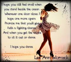 - I Hope You Dance by Lee Ann Womack: This is such a simple song but the words are so powerful. Every time I hear this song, it makes me stop & really think about how I’m living. The metaphor of “I hope you dance” is so perfect for expressing the need to live actively rather than passively letting life pass us by. I also love the fact that this song reminds us of the importance of standing in awe of nature, taking a chance on loving others, & never letting our hearts grow bitter. http://www.youtube.com/watch?v=RV-Z1YwaOiw&ob=av3e