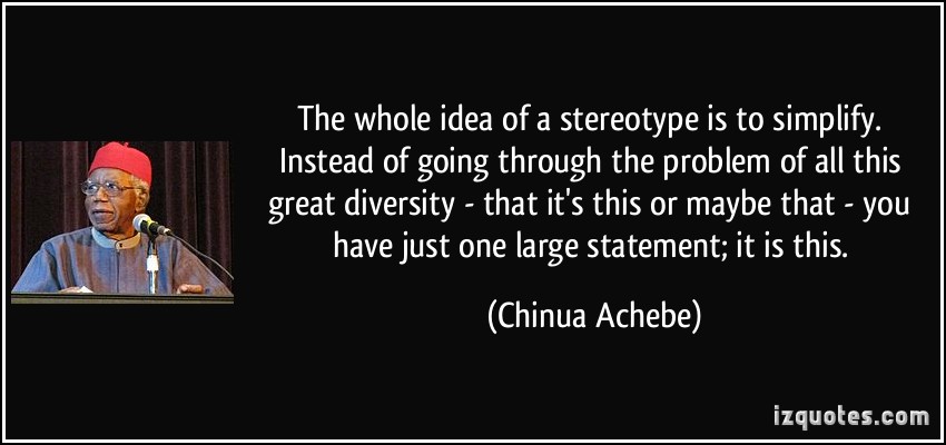 What struck me the most about this band is not only their unique sound but the lead singer’s ability to break stereotypes.  This led me to ponder my never-ending fascination with people who break stereotypes, whatever they may be.  As the Nigerian novelist, poet, & professor Chinua Achebe said, “The whole idea of a stereotype is to simplify. Instead of going through the problem of all this great diversity – that it’s this or maybe that – you have just one large statement; it is this.”  Indeed the world is very complicated & it’s not so shocking that society has created stereotypes to try to make sense of such a complex world.  And yet, the result of such stereotyping is that we often miss out on the joy that can be found in embracing the complexity of this world & the people around us.